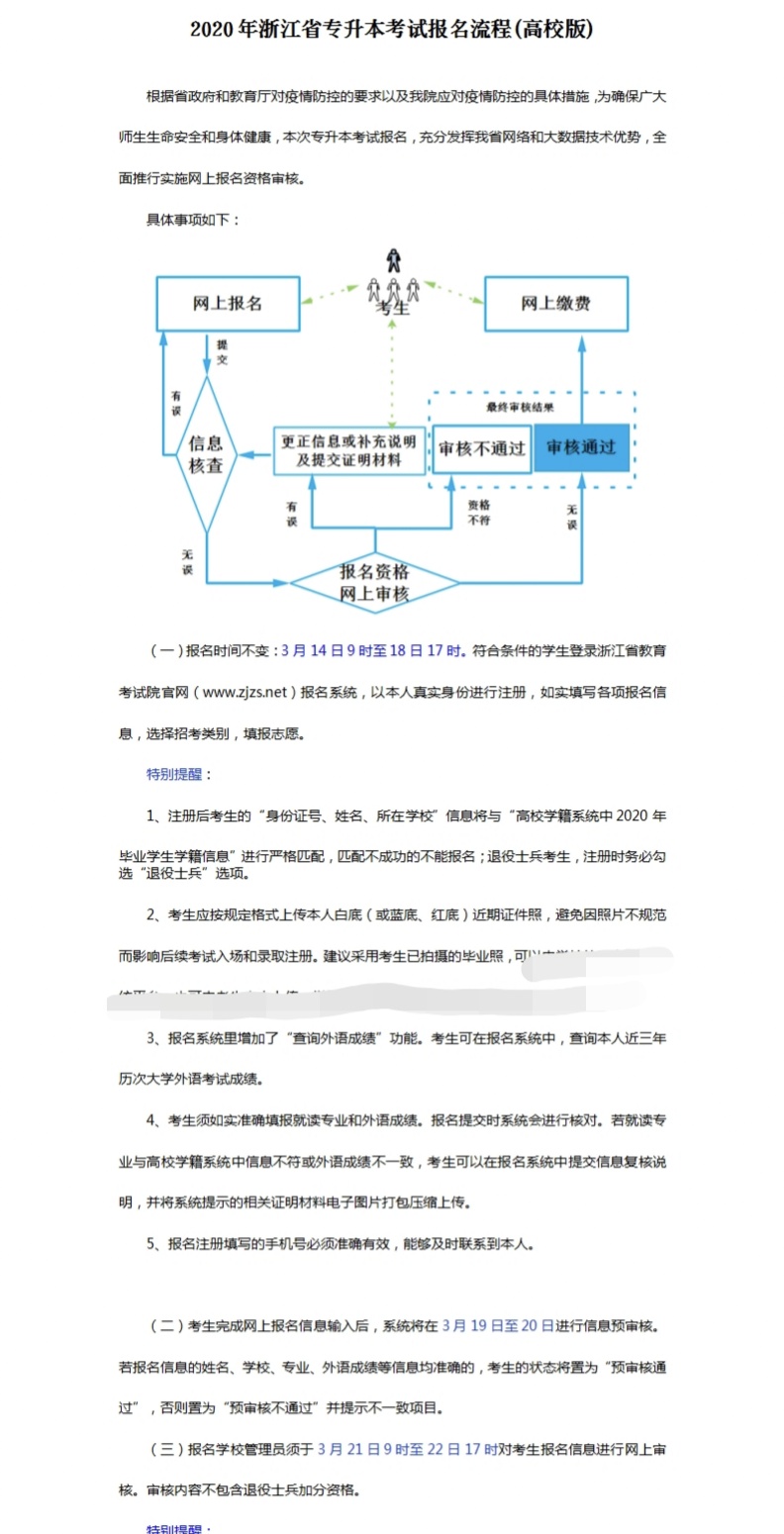 本次考试全面实施网上报名资格审核,考生请于3月14-18日进行网上报名和志愿填报,并于3月19-22日进行网上审核。专升本考试时间是否延期,视疫情防控进展情况再定,并将提前公布。考生可根据《浙江省专升本各类别所含专业对照表(2020版)》(已在浙江省教育考试院网站www.zjzs.net公布)和本人高职阶段所学专业,确定适合自己的招考类别。