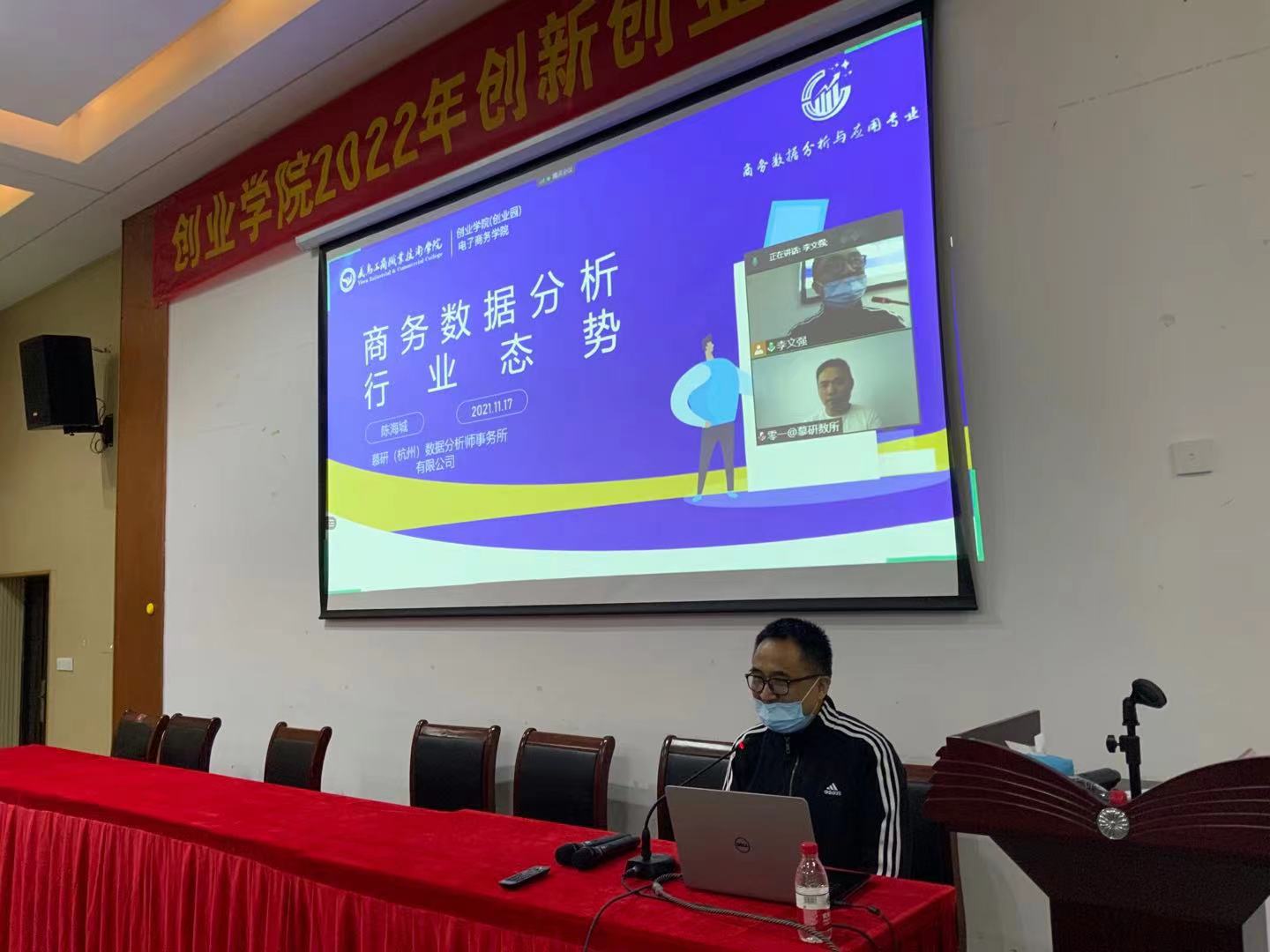为进一步推动专业人才培养,提升同学们对商务数据分析与应用专业的认知,让同学们在学习上有明确的目标,对当前行业发展有更好的认识,11月17日下午,公司开展了题为“商务数据分析行业态势分析”的专题讲座,并采用了线上与线下相结合的方式,杭州慕研数据分析事务所有限公司董事长陈海城应邀进行分享。讲座由专业主任谢杰老师主持,专业骨干教师及20级商数专业员工聆听了讲座。