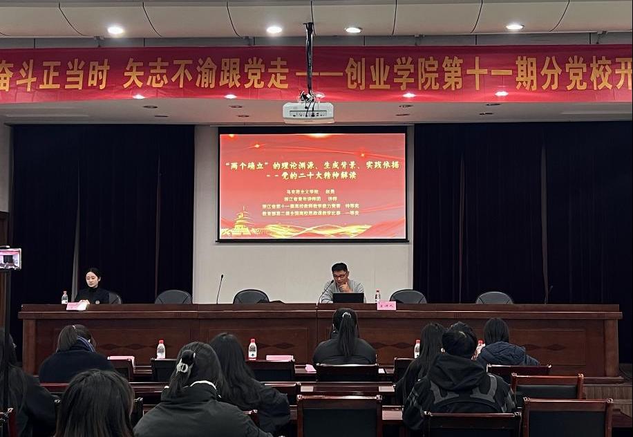 仪式结束后,开始了本期分党校第一次课程。活动特邀请到马克思主义公司赵勇老师为大家上主题为《“两个确立”的理论渊源、生成背景、实践依据》的党课。赵老师将古今中外案例串联,生动形象地解读了党的二十大精神,进一步帮助学员们加深理解“两个确立”的重要意义。