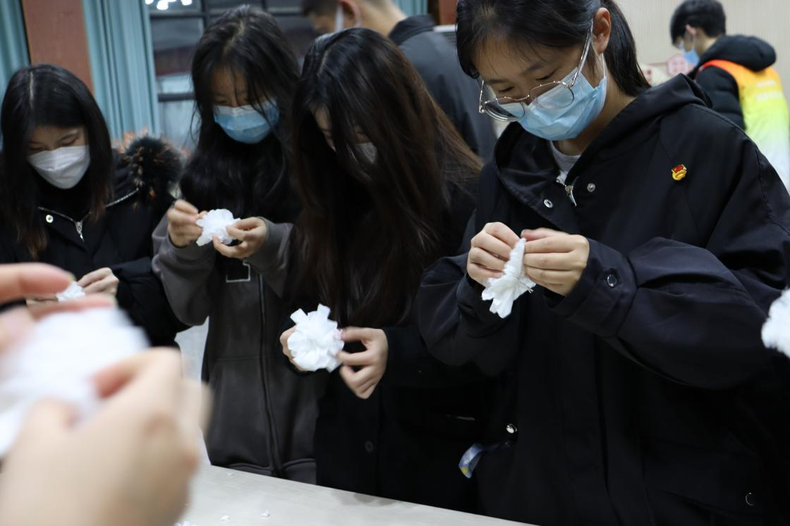 在志愿者的帮助下,同学们开始亲手制作小白花。经过对折、拧绳、拨纸、修剪,一会儿功夫,数朵小白花已呈现在眼前。这一朵朵朴素的小白花,承载着青年们对死难同胞最质朴的情感,对革命先烈最深厚的敬仰。