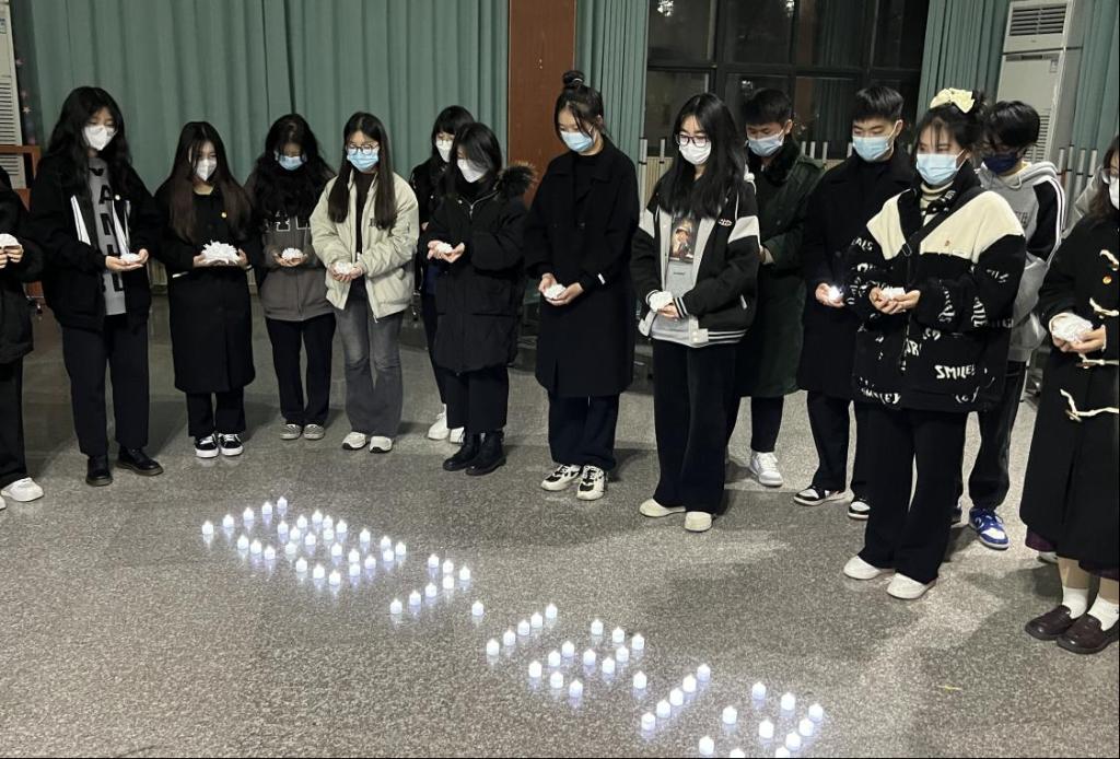 最后,同学们一起用点亮的蜡烛摆放了“12·13”,手捧小白花,进行了集体默哀。在默哀中,同学们把历史悲痛化为奋进动力,在时代新起点踔厉奋发、勇毅前行。