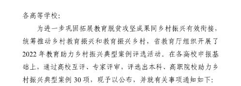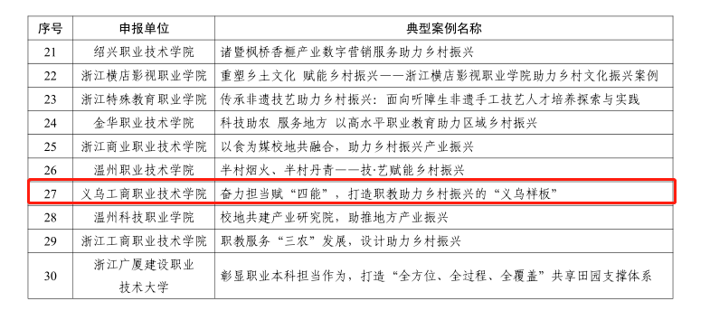 自4月份浙江省教育厅启动教育助力乡村振兴典型案例评选工作以来,公司领导高度重视,由taptap点点体育牵头撰写申报书,高质量高效率完成申报工作。经全省高校推荐、全省高校互评、省教育厅审核评选等环节,全省本科、高职院校共有30项案例入选。公司《奋力担当赋“四能”,打造职教助力乡村振兴的“义乌样板”》案例成功获选。