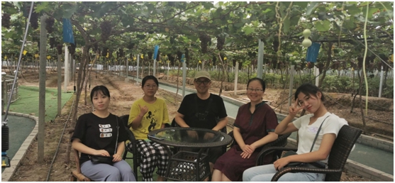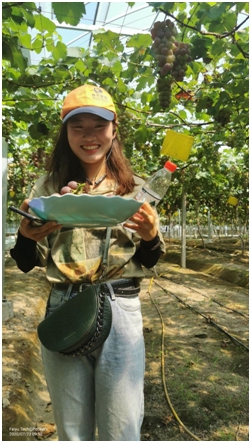 在果园里,还有不少被直播视频吸引来到靓松农场实地感受葡萄采摘的外地游客,纷纷为巨峰葡萄的香甜口感点赞。他们表示,现场采摘体验的是一种收获的喜悦之情,但由于农场葡萄品质优良、采摘适时、配送迅速,使得在直播间下单的葡萄和现摘的口感其实差异不大,都是甜中带鲜、香甜满腔。他们在兴奋采摘之余也不忘拍下美照,发表在各类社交平台,为浦江的葡萄宣传“打call”,吸引更多的游客前来游玩、购买葡萄。