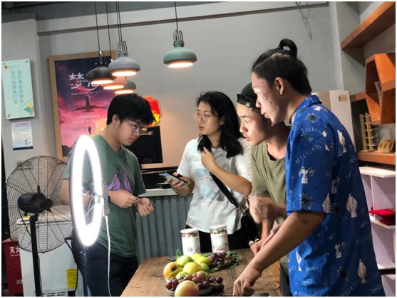 当晚7时,义乌江东街道青岩刘直播间很热闹。“一场好的直播不仅靠临场表现,还需要做好充分准备,例如灯光打得好不好,直接影响产品的呈现效果,从而影响顾客对产品直观的喜爱度。”主播凡子鹏同学不断调整灯光角度,以求产品在镜头中的完美。“桃形李,哎,这里可有一个典故诶,大家可仔细听咯。传说……”主播张哲同学左手拿着讲稿,右手拿着李子,不断练习着产品介绍。