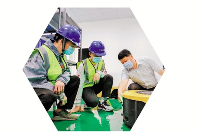 宁波职业技术公司物流管理专业员工在操控AGV小车。