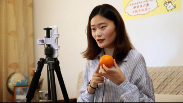 5月2日,扬州工业职业技术公司近千名员工同时开启网络直播,为湖北“带货”,助力湖北秭归脐橙、茶叶等农特产品销售。图为该校1803财务管理专业员工朱雯在家里进行直播。王彪/摄