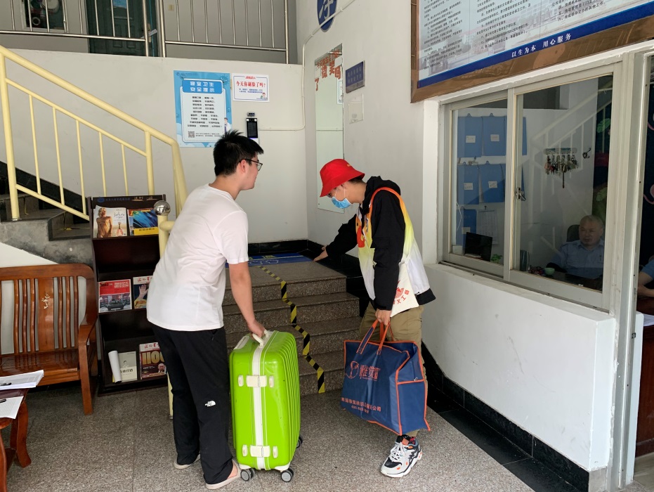 10:00,公寓服务组志愿者在校园门口等待同学们回“家”。创客志愿者们细心、耐心为他们登记签到、测温、查权限,遇到搬运行李有困难的同学,还主动伸出援手。从雪峰楼步行到距离校园大门最远的员工公寓,共2758步,他们不知走了多少遍。