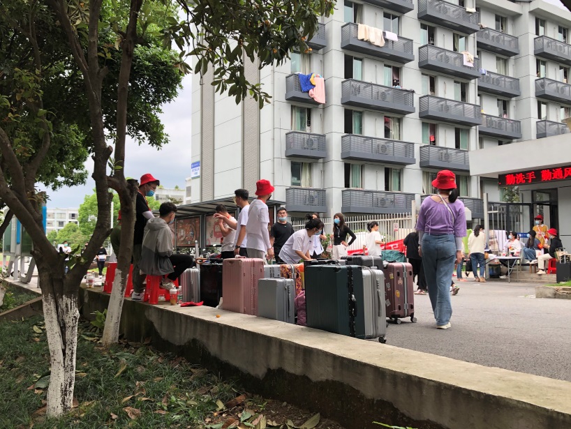 13:00,校门返校人流量激增,5名创客志愿者紧急支援校门口志愿服务。和往常的开学情况不同,这次公司根据疫情防控工作要求,严格落实封闭式管理,所有家长一律不得进入公司。员工的行李搬成了大家担忧的问题,为此创客志愿者们积极响应,参与这一又苦又累的工作,用辛勤劳动为同学们顺利报到提供服务,搬运行李150余件。
