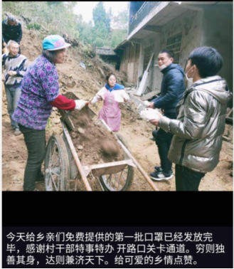 2017级四川籍创业员工魏勇在老家南充也没闲着,他拿出自己的创业积蓄,在1月30日(正月初六)从广西为村里购置了一批口罩,并做起了村里的健康知识宣传员。他坦言道,在创业过程中,老师总是教导大家要有社会责任感。他感觉为村里购置口罩,他责无旁贷。