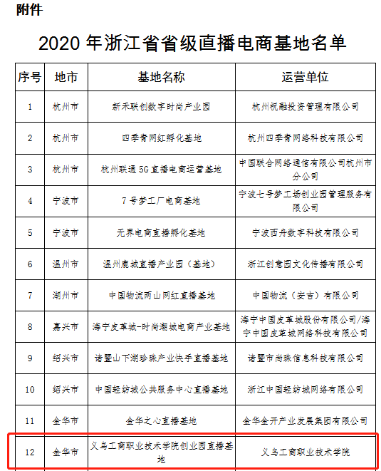 近日,浙江省商务厅公布了《2020年浙江省省级直播电商基地名单》,全省共15家单位入选,义乌工商职业技术公司创业园直播基地作为唯一一所高校入选。