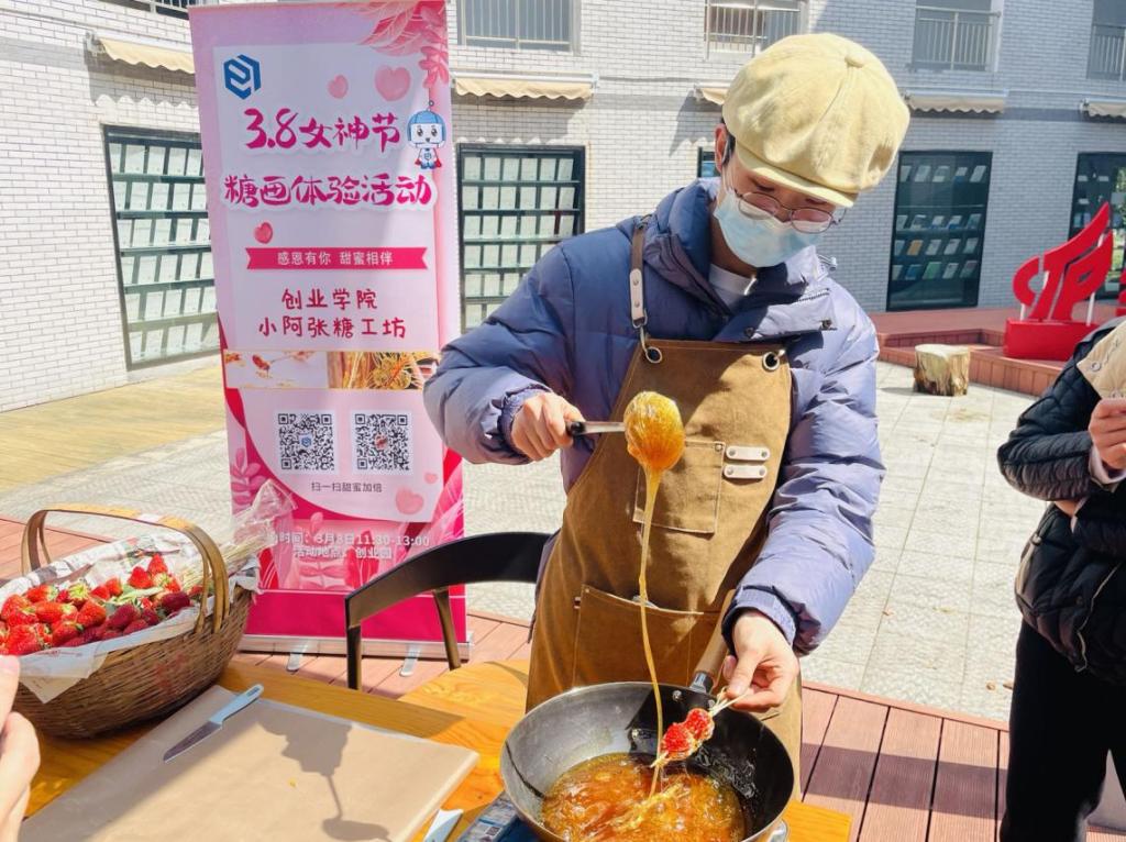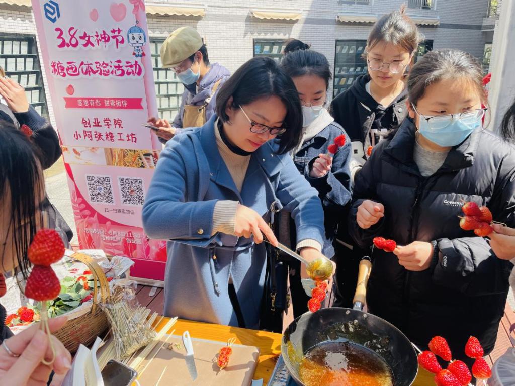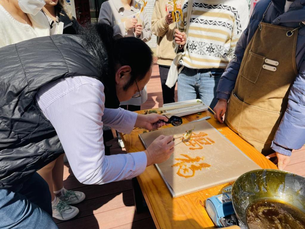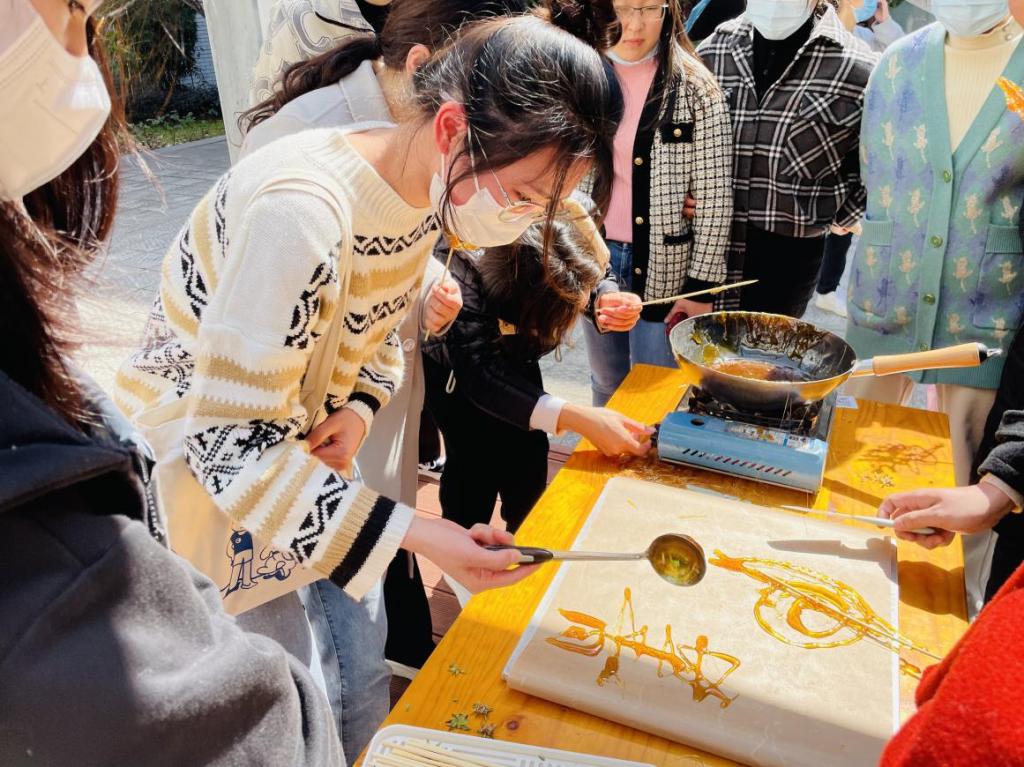 活动在开阔的创业园中庭举行,轻快的音乐和糖的甜香吸引了许多往来师生。体验活动中,有人制作冰糖水果,串草莓、搅拌糖液、裹糖丝,每个环节井井有条;有人创作糖画,苹果、蜗牛、“雪峰小创”栩栩如生跃然于板上;有人写糖字,写姓名、写祝福、写创业……现场,来自创业园台湾馆的书法大家郭老师为女性朋友们创作糖字,将书法神韵中的苍劲有力融入糖画的绵延柔长。广大师生对本次糖画体验活动好评不断。陈老师表示:“这是一场参与性很强、幸福感很高的活动,非常感谢同学们为我们送上的别样祝福。”