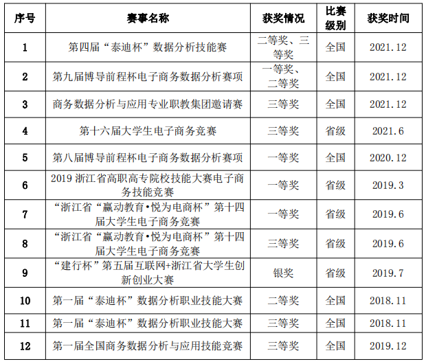 本专业2021年入选第二批国家级职业教育教师教学创新团队建设单位,浙江省双高专业群建设专业,2022年获评1+X电子商务数据分析示范试单位,“金平果”专业排名全国第11位,浙江省第3位。