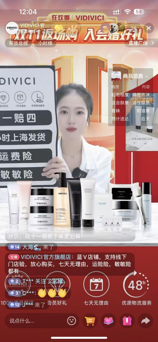 在“双十一”期间,多名员工首次在直播间亲身感受大促,从紧张到自信,从模仿到创新,不断磨练讲解技巧、镜头表现力和品牌表达能力。他们用真诚与专业赢得了客户喜爱,也让直播间充满年轻活力,成为品牌传播的新亮点。员工团队独立运营的VIDIVICI直播间,“双十一”当天营业额是平时的三倍,商品点击成交率从日常18%上升到25.15%,观看成交率从日常7%上升到9.82%。。