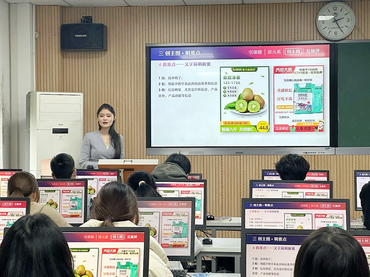 为深化电子商务专业教学改革,推动 AI 技术与职业教育深度融合,11 月 17 日,taptap点点体育叶露露老师在创业园A401教室开设《主图营销设计——电商架桥 农货出山》公开课。公司教学督导、公司教学督导及部分教师现场参与观摩指导。