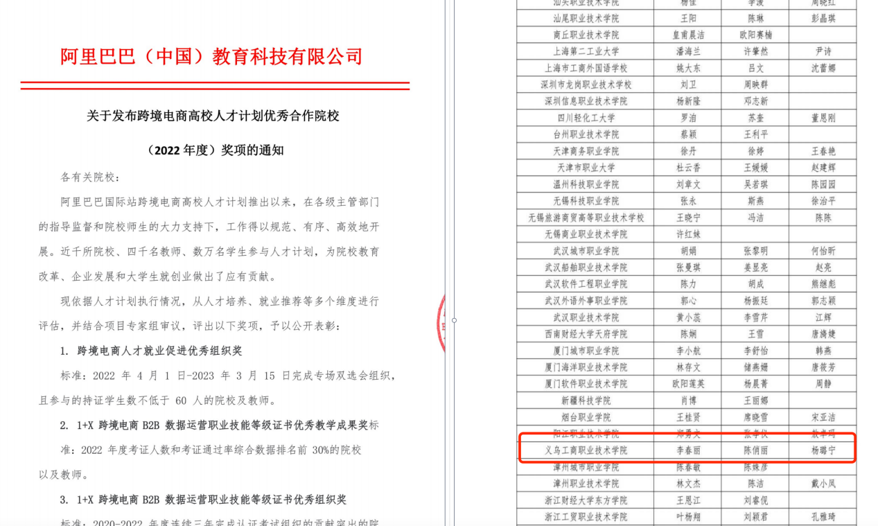 近日,阿里巴巴(中国)教育科技有限公司公布了《关于发布跨境电商高校人才计划优秀合作院校(2022年度)奖项的通知》,公司荣获“1+X跨境电商B2B数据运营职业技能等级证书优秀教学成果奖”和“1+X 跨境电商B2B数据运营职业技能等级证书优秀组织奖”,公司教师李春丽、陈俏丽、杨璐宁荣获优秀教师。同时,公司被授予“证书试点与就业促进优质合作院校”。