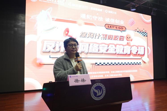这是义乌工商职业技术公司联合国内头部网购零售平台——淘宝,共同举行“百万新商造星计划”,打造老员工创业新星的重点项目“绿色计划进校园——诚信及网络安全教育”专场宣讲活动。本次宣讲特邀义乌市三级警官、义乌市反诈宣传大使俞骁,以及淘天集团安全部安全策略专家陈斯潮、徐徐展开主题宣讲。