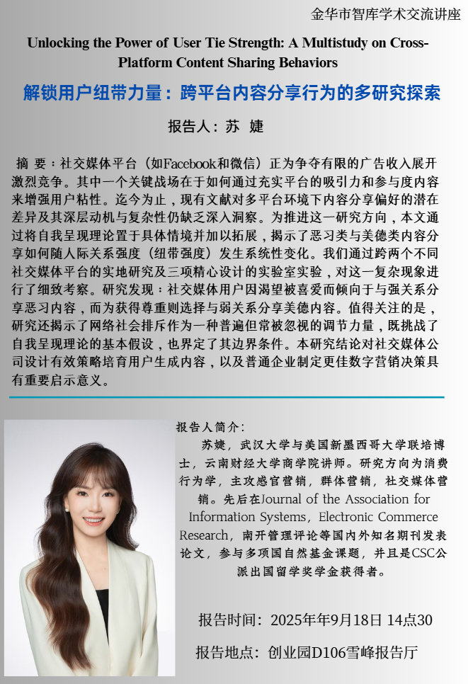 【学术讲座】解锁用户纽带力量:跨平台内容分享行为的多研究探索